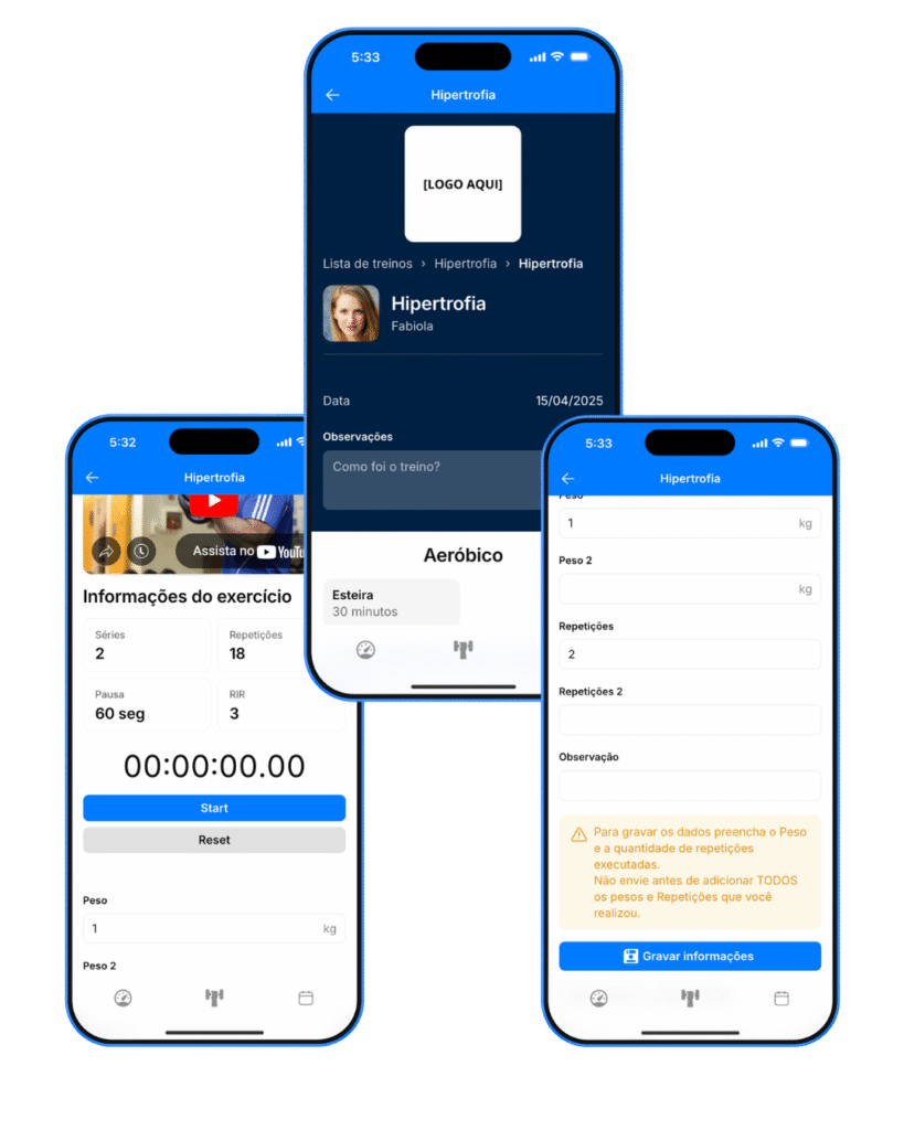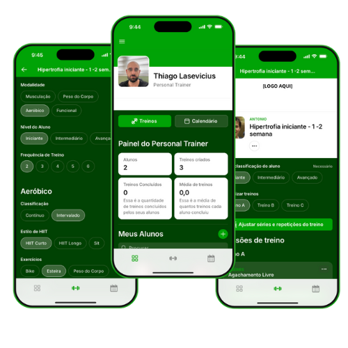 Você conta com dois ambientes: um painel exclusivo para você gerenciar tudo e um app para o aluno receber treinos com uma experiência premium — do jeito que merece.