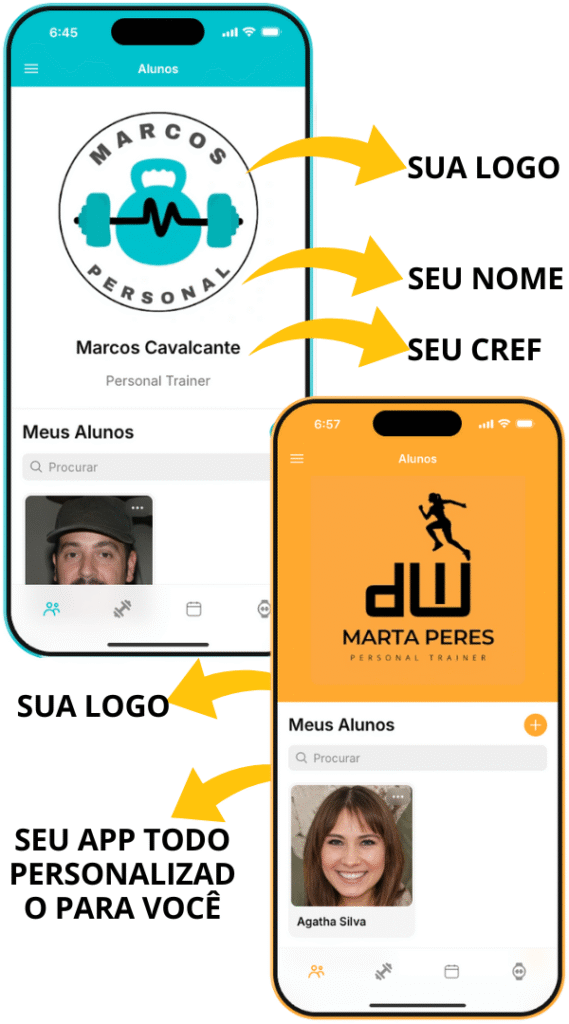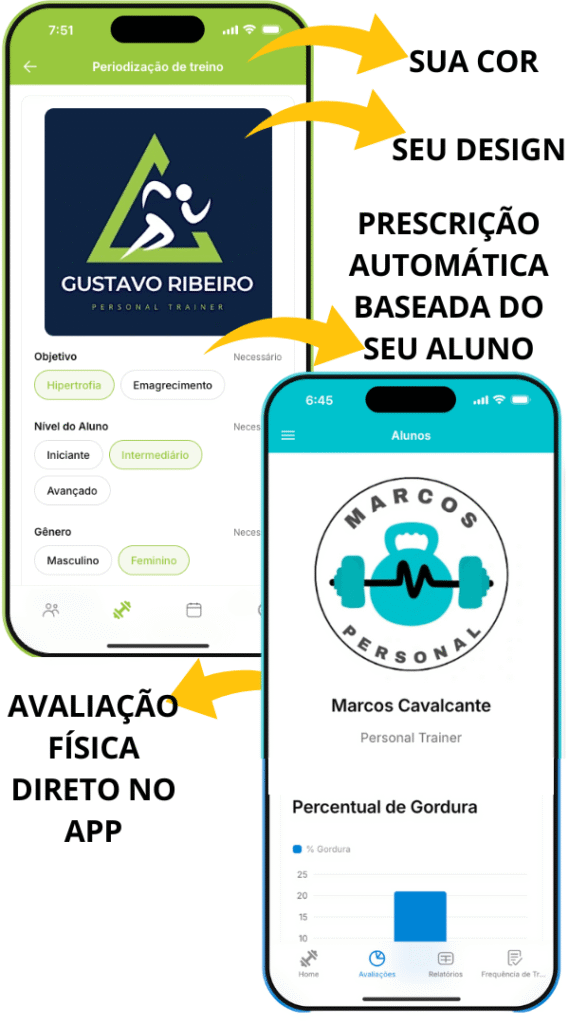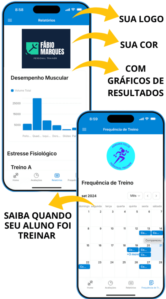 Tenha seu próprio APP PERSONALIZADO com sua LOGO e CORES para manter seus alunos mais tempo nas sua consultorias e prescrever treinos mais rápidos